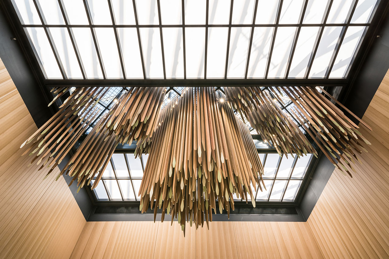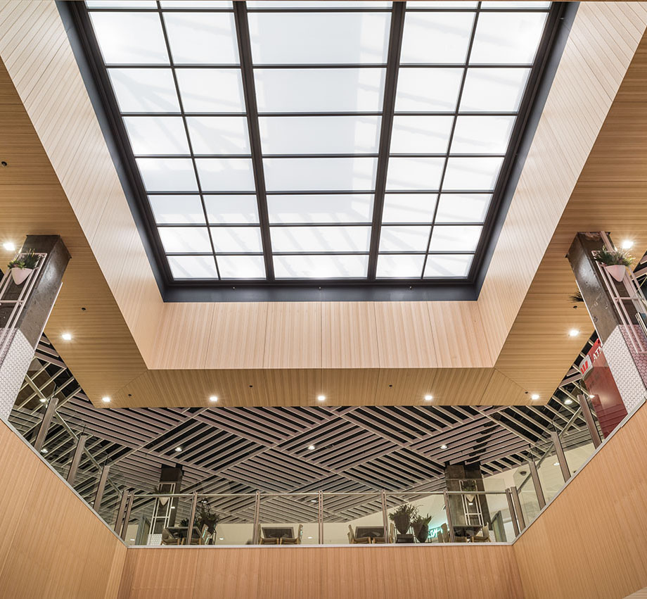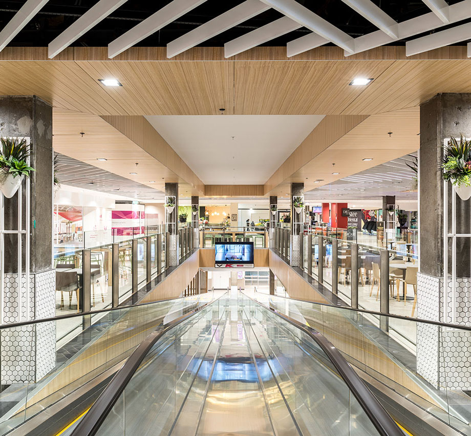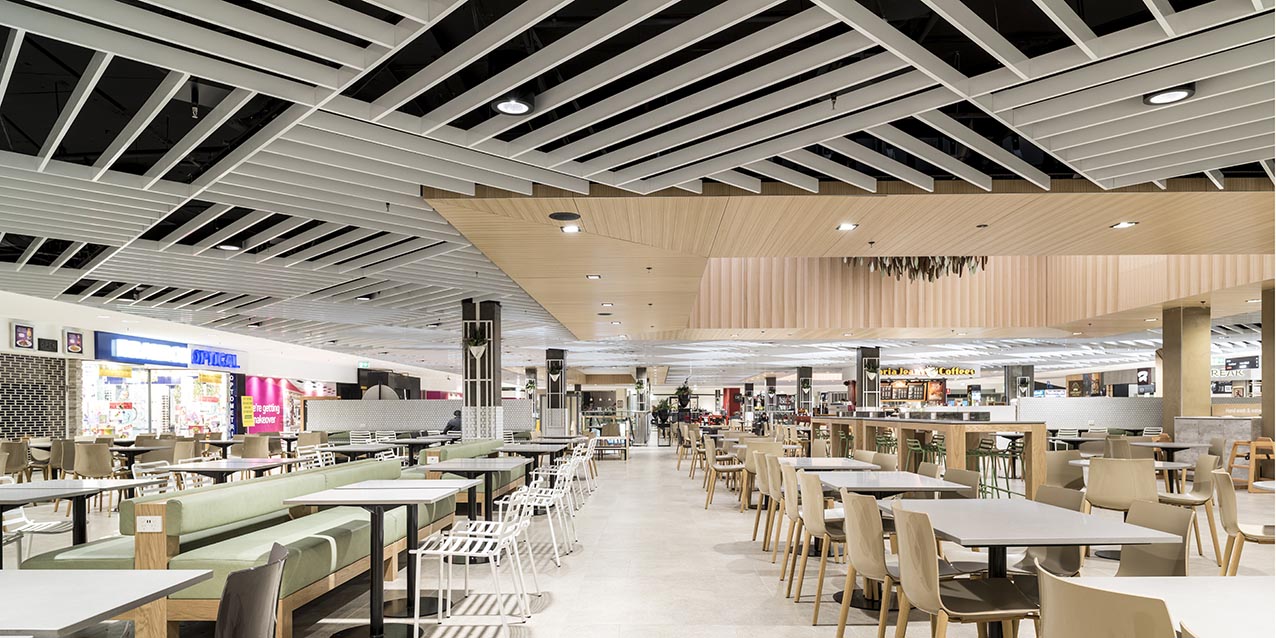 The $4.5m foodcourt upgrade for Vicinity Centres included the removal and reinstatement of more than 4,000m² of mall tiling, together with two levels of feature ceilings and skylights. A custom-made sculpture, created from 850 individual pieces of spotted gum timber, hangs as the project’s centre piece. The Foodcourt’s furniture, both loose and fixed, was replaced and the amenities upgraded. The project was heavily staged over 17 weeks to ensure the Centre continued trading successfully and safely.