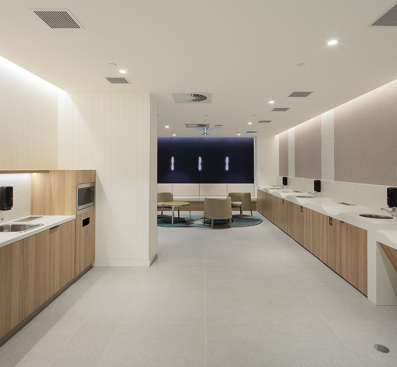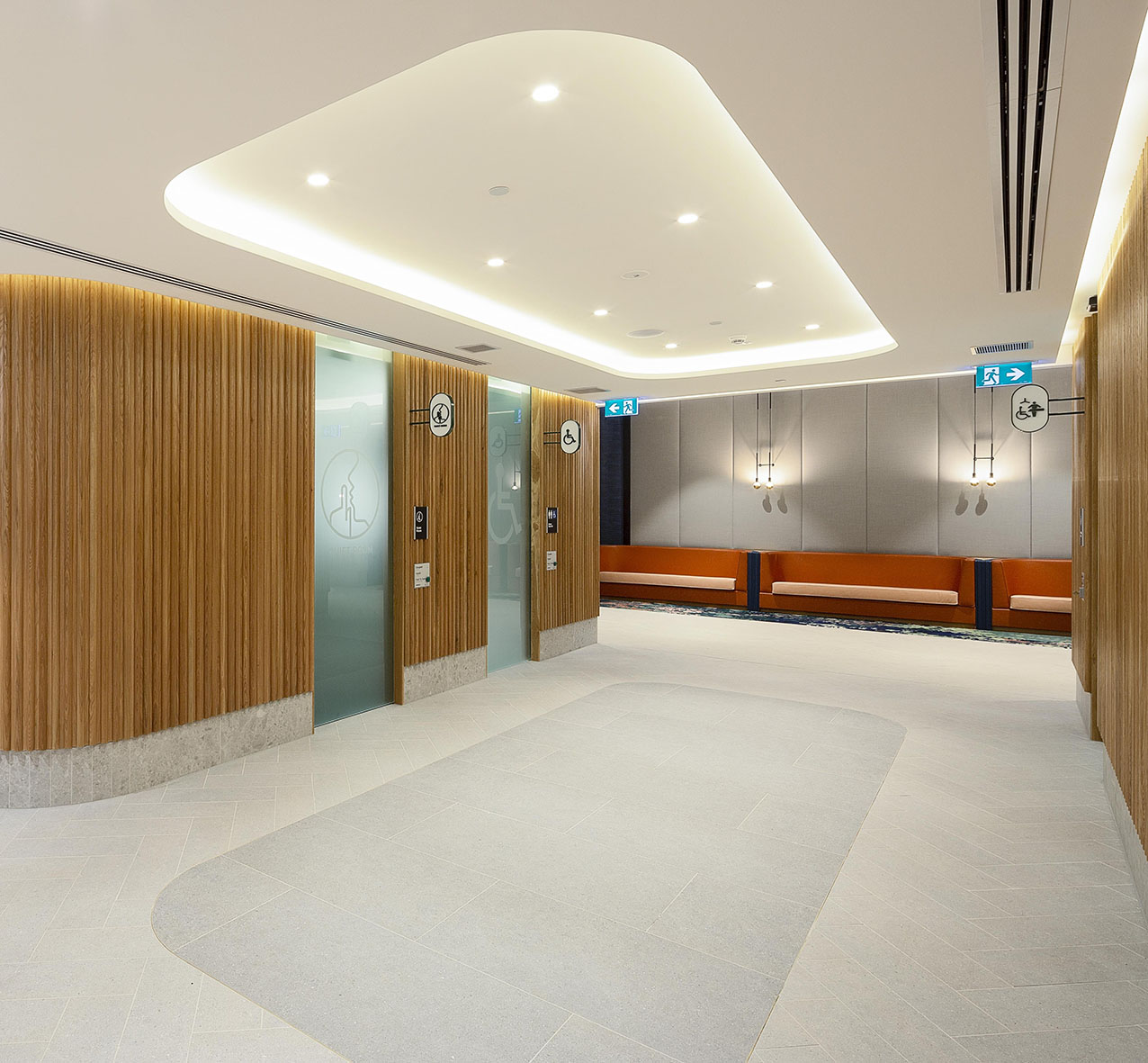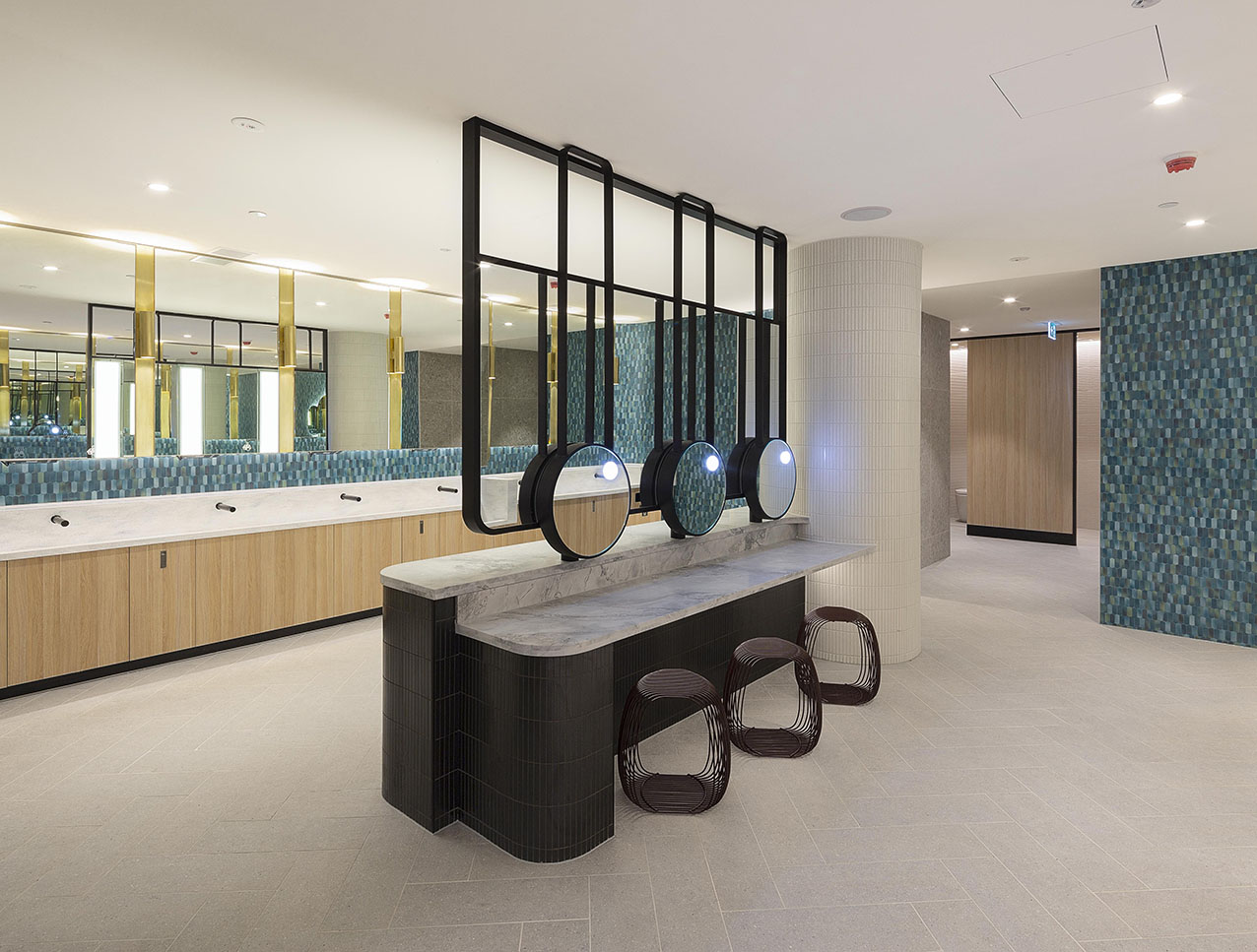 This transformation involved enlarging the existing 176m² amenities to 640m² by expanding through neighbouring retail tenancies, resulting in extensive structural and services changes. The scope included a new entry foyer with banquette seating, Certified Changing Places Facility, Parents Room, DDA, Male and Female amenities with feature make-up bar. The extraordinary transformation for Vicinity was achieved in an accelerated 12-week programme.