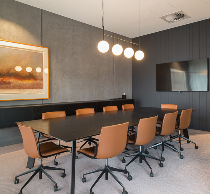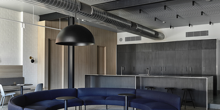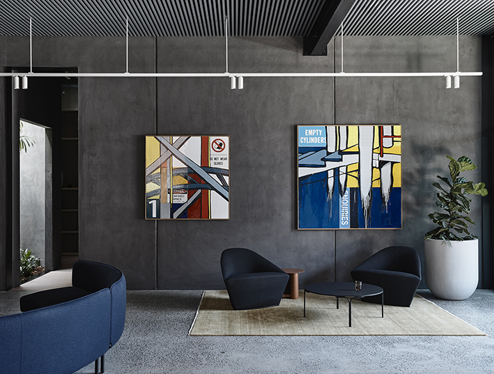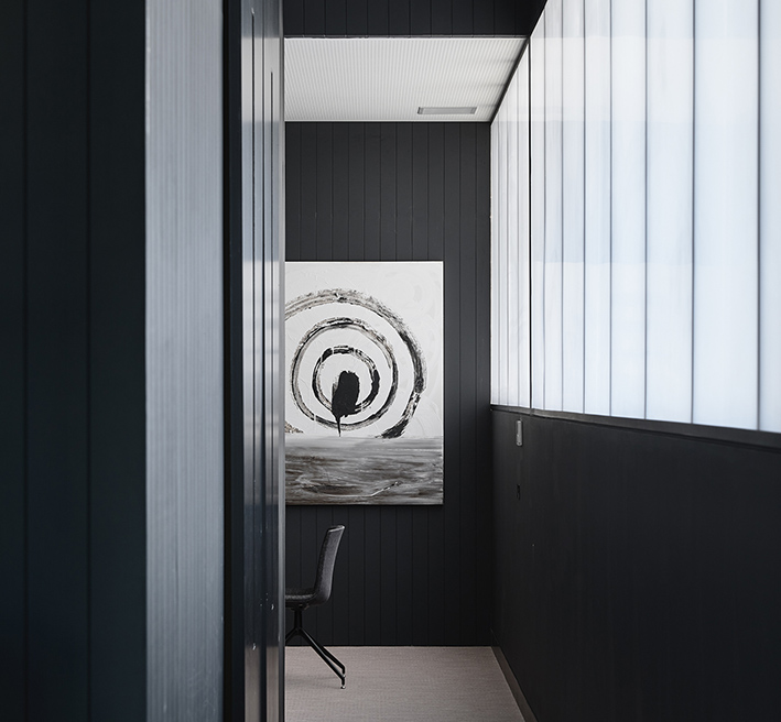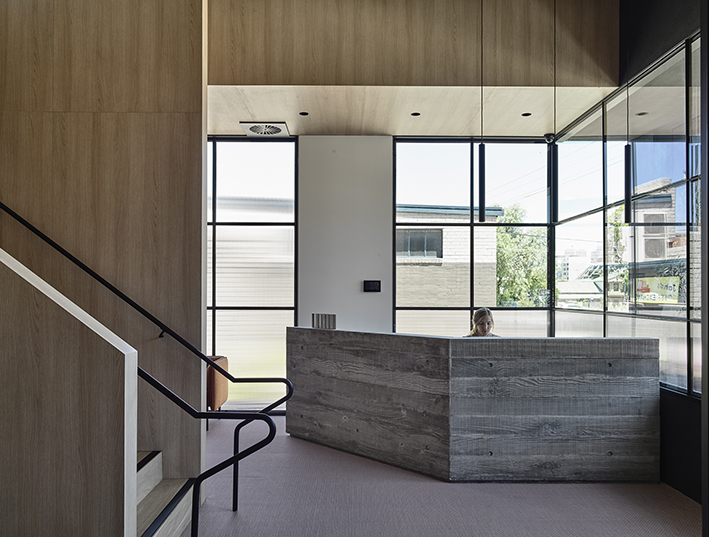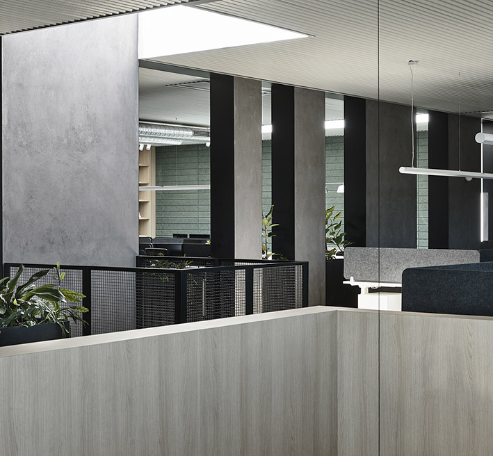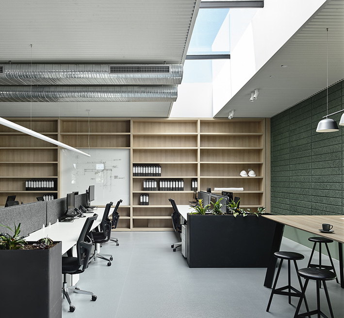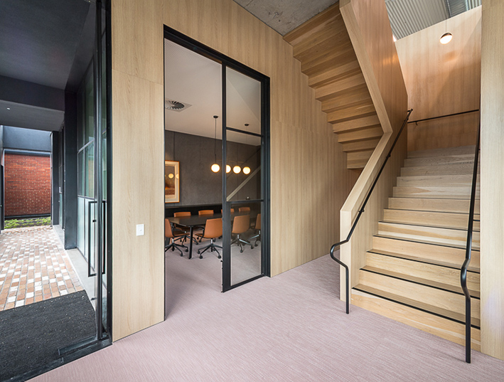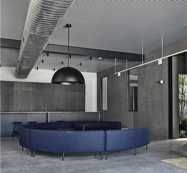 Designed by Wellard Architects, IGHQII in Clifton Hill saw two existing warehouses, through substantial structural interventions, transformed into an 800m², two-storey office building. The exterior features webforge steel cladding with mild steel shrouds adorning to all openings. Inside, meticulous attention to detail was paid to architectural finishes, including Sculptform ceiling linings; glazed steel partitions; Baux acoustic linings and Bolon vinyl flooring, creating a distinctive workspace that marries aesthetics with contemporary workplace design.