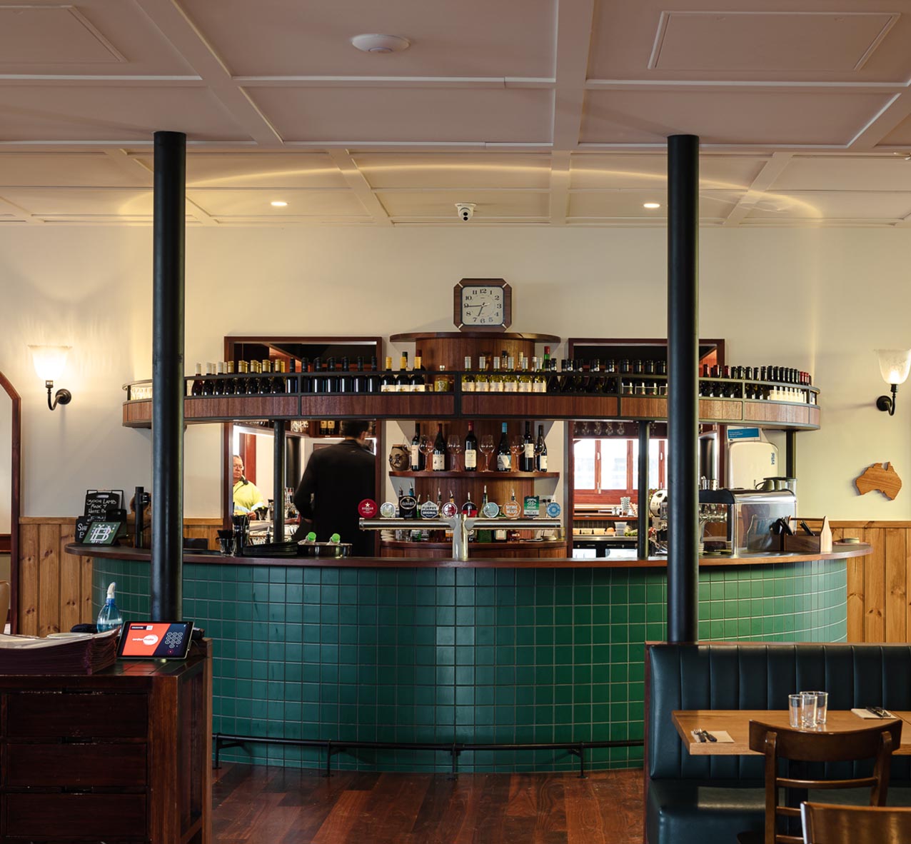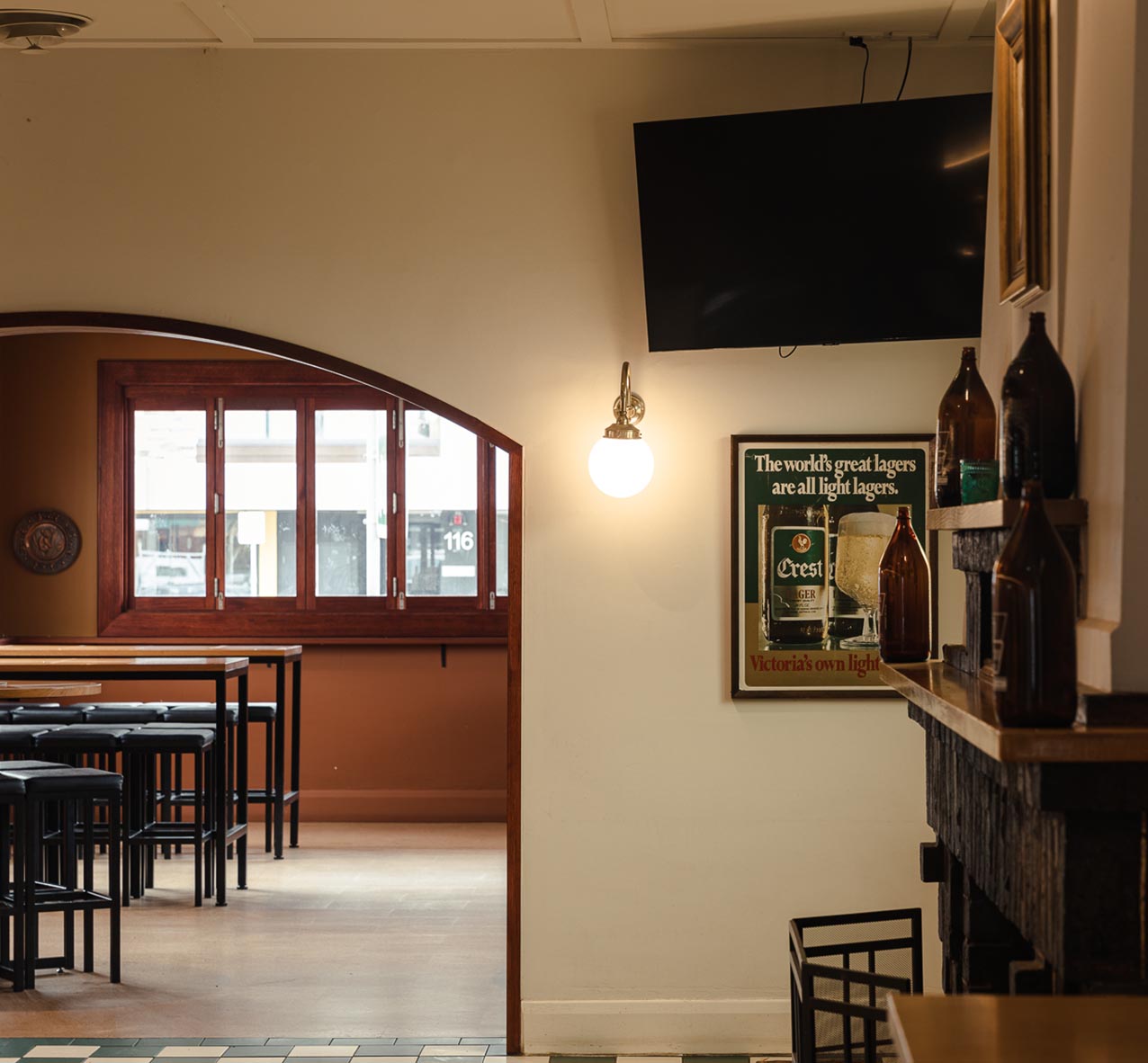 The 1926 heritage art deco pub on Watton Street in Werribee underwent a meticulous twelve-month refurbishment in 2020 amidst the challenging backdrop of lockdown restrictions. The iconic pub facade was diligently restored, along with three fireplaces and the chequerboard black-and-white tiling in the public bar. Every aspect besides these historical elements has been thoughtfully reconceived by Bergman and Co, modernising the amenities while honouring the establishments rich legacy.